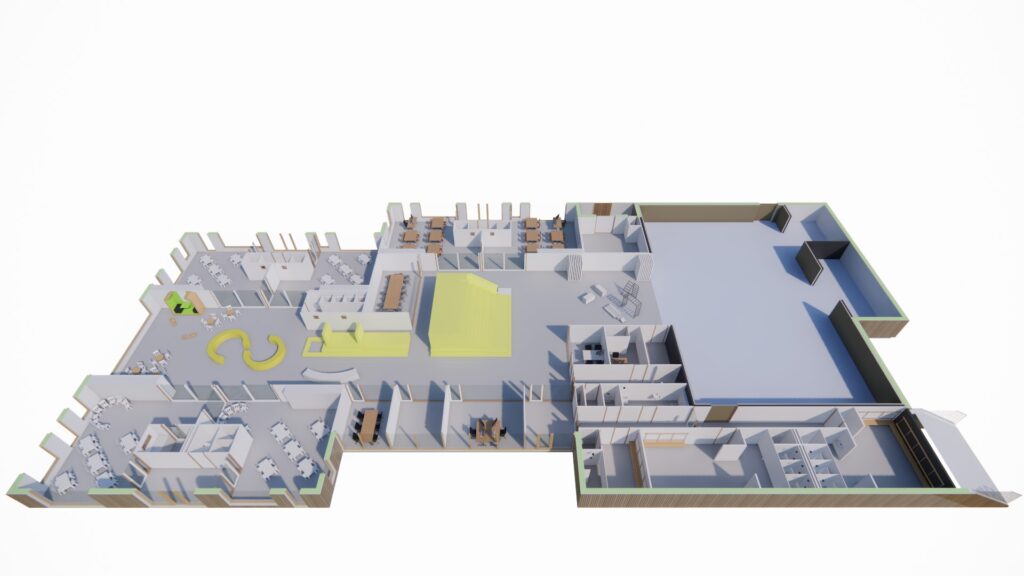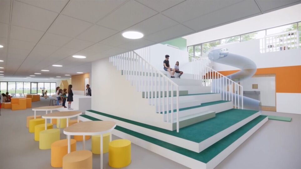 De indeling is hierdoor erg flexibel en mocht de school in de toekomst expansiedrift krijgen dan is de school ook eenvoudig uit te breiden waarbij de aanwezige gevelelementen hergebruikt kunnen worden.