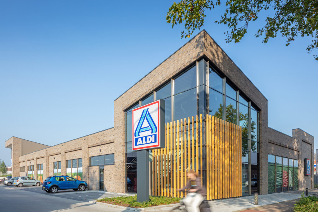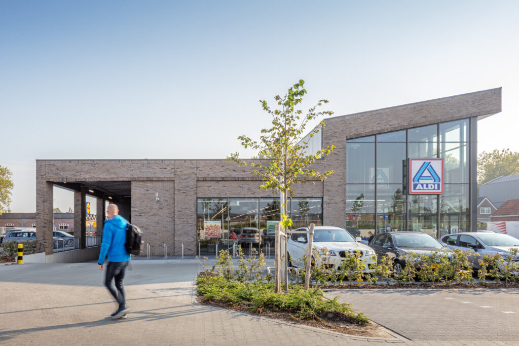 De nieuwe Aldi-vestiging is ongeveer de helft groter dan de oude winkel. De variatie in het gevelmetselwerk, met terug liggende vlakken en verschillende kleuren voegwerk zorgt voor een echte eyecatcher in de omgeving.